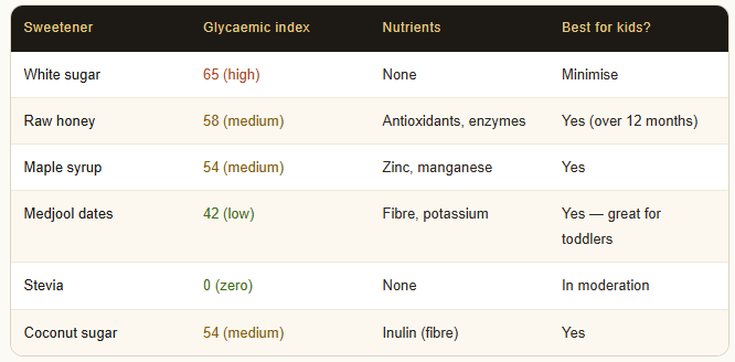 The good news is that reducing added sugar does not mean living without sweetness. There are several natural alternatives that provide sweetness with a lower glycaemic impact, additional nutrients, or both. Here are the five most practical for family cooking: