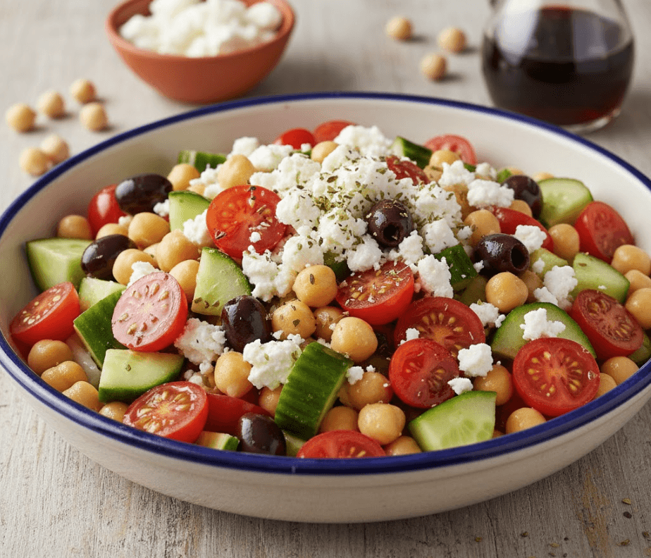 Step 3: Combine chickpeas, veggies, and crumbled feta in a large mixing bowl.
