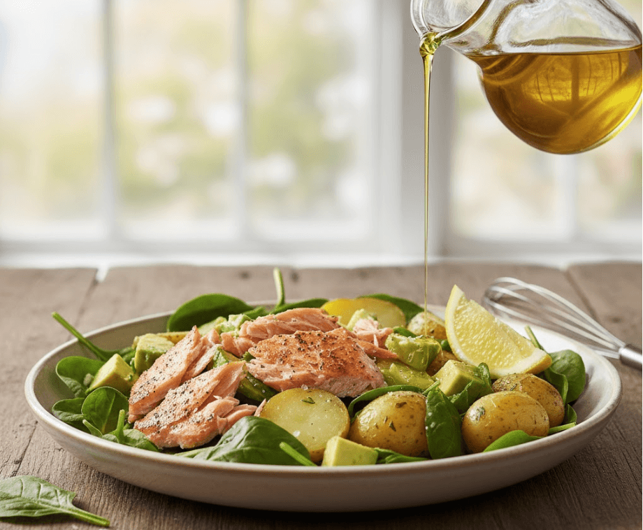 Step 4: Whisk the dressing ingredients and pour over the salad while the potatoes are still slightly warm to absorb the flavor.