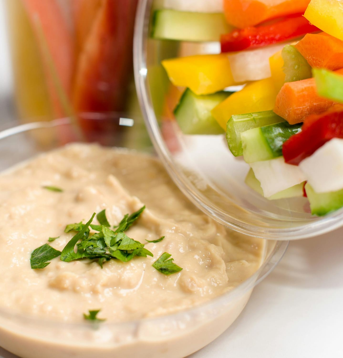 Method: Place the hummus in a leak-proof small container in the center. Surround it with colorful "dippers."